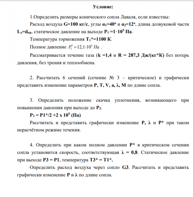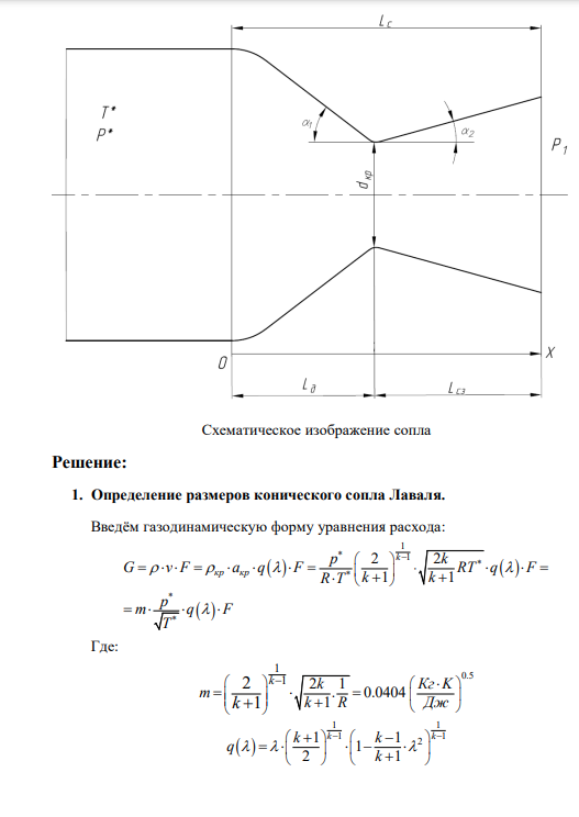 1.Определить размеры конического сопла Лаваля, если известны: Расход воздуха G=100 кг/с, углы α1=40о и α2=12о , длина дозвуковой части Lд=dкр, статическое давление на выходе Р1 =1  105 Па. Температура торможения Т1*=1100 К. Полное давление * 5 1P   12,1 10 Па . Рассматривается течение газа (k =1,4 и R = 287,3 Дж/(кг*К) без потерь давления, без трения и теплообмена.
