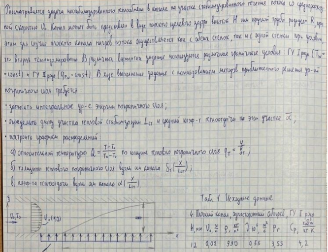 В данном файле представлено домашнее задание по МЖГ ч. 2 вариант 4а (плоский канал, односторонний обогрев, ДУ 2 рода), принятое Марковым П.В. Условие - в ПДФ файле (см. описание) Качество почерка - посредственное: