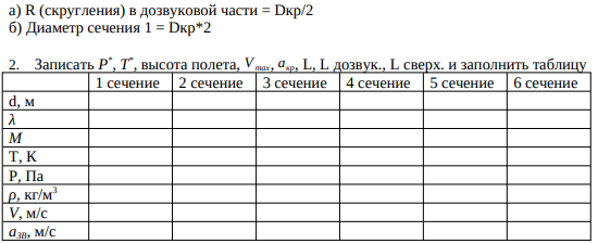 Показать/скрыть дополнительное описаниеСпроектировать с помощью ГДФ сопло Лаваля на заданные параметры. Необходимо определить vMAX, aKP и получить в 6 сечениях значения T, P, , v, a, , М. Затем рассчитать полученное сопло на 2 нерасчетных режимах течения (вторая часть) (для высоты выше расчётной на 10 км и для высоты 100 м). Графики выполнять под чертежом сопла..