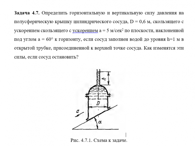 Задача 4.7. МЖГ Определить горизонтальную и вертикальную силу давления на полусферическую крышку цилиндрического сосуда, D = 0,6 м