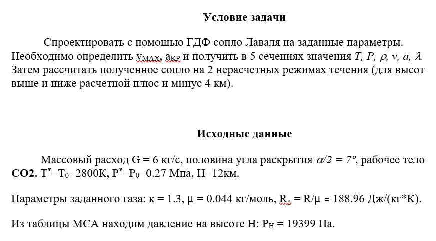 Условие задачи Спроектировать с помощью ГДФ сопло Лаваля на заданные параметры. Необходимо определить vMAX, aKP и получить в 5 сечениях значения T, P, , v, a, . Затем рассчитать полученное сопло на 2 нерасчетных режимах течения (для высот выше и ниже расчетной плюс и минус 4 км). Исходные данные Массовый расход G = 6 кг/с, половина угла раскрытия /2 = 7º, рабочее тело СО2. T*=T0=2800К, P*=P0=0.27 Мпа, H=12км. Параметры заданного газа: к = 1.3, μ = 0.044 кг/моль, Rg = R/μ = 188.96 Дж/(кг*К). Из таблицы МСА находим давление на высоте H: РН = 19399 Па. .