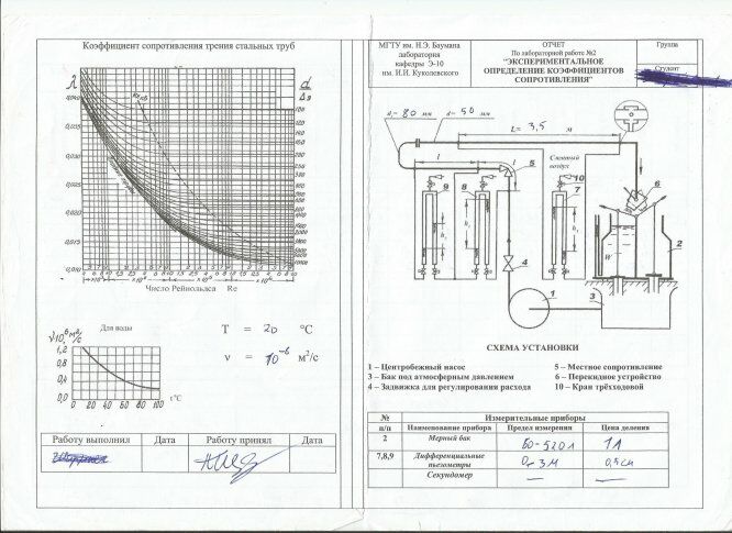 Для студентов МГТУ им. Н.Э.Баумана по предмету Механика жидкости и газа (МЖГ или Гидравлика)Эксперементальное определение коэффициентов сопротивленияЭксперементальное определение коэффициентов сопротивления
