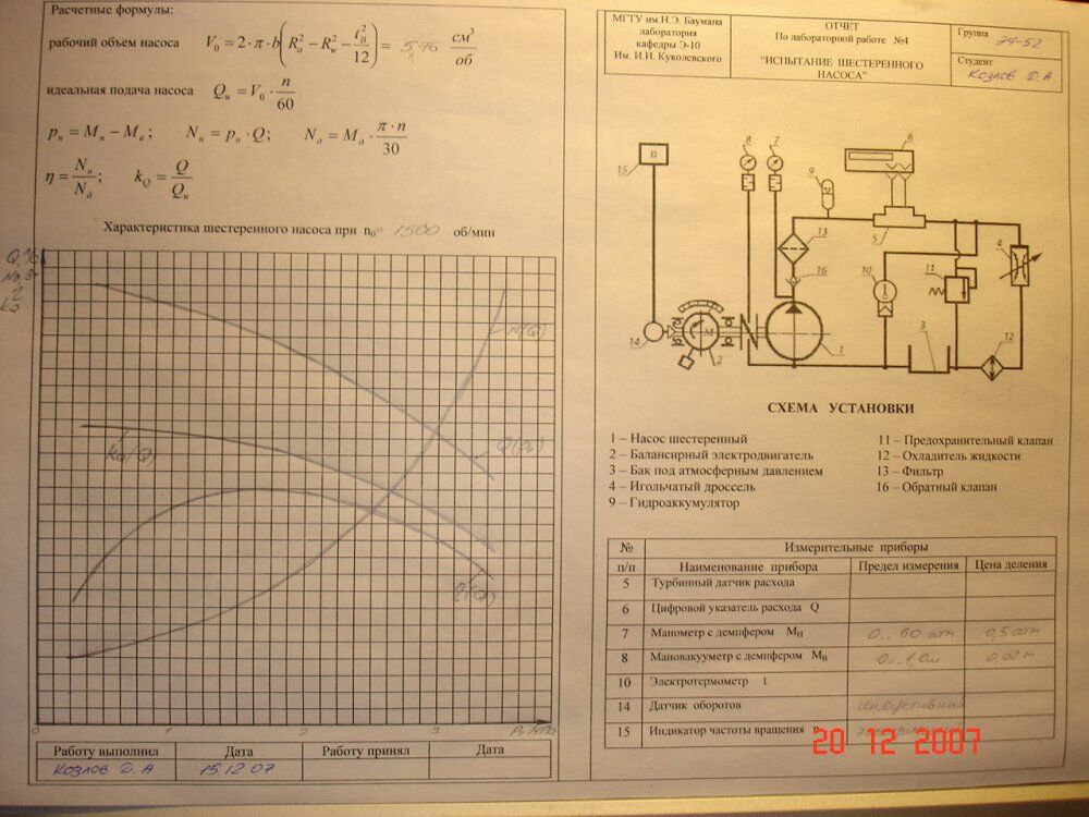 Для студентов МГТУ им. Н.Э.Баумана по предмету Механика жидкости и газа (МЖГ или Гидравлика)Испытание шестеренного насосаИспытание шестеренного насоса