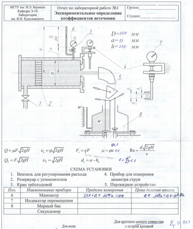 Для студентов МГТУ им. Н.Э.Баумана по предмету Механика жидкости и газа (МЖГ или Гидравлика)Экспериментальное определение коэффициентов истеченияЭкспериментальное определение коэффициентов истечения