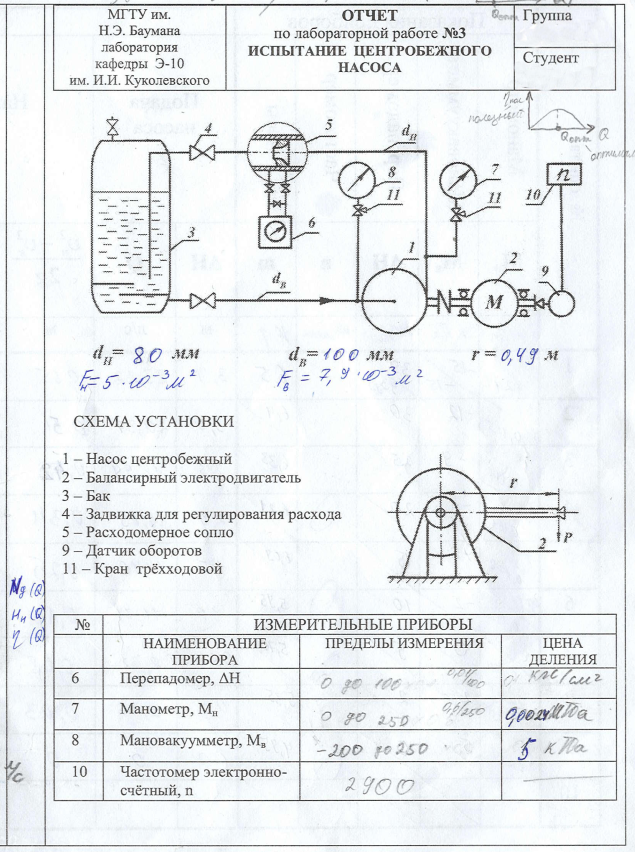 Для студентов МГТУ им. Н.Э.Баумана по предмету Механика жидкости и газа (МЖГ или Гидравлика)Испытание центробежного насосаИспытание центробежного насоса