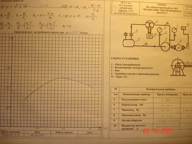 Для студентов МГТУ им. Н.Э.Баумана по предмету Механика жидкости и газа (МЖГ или Гидравлика)Испытание центробежного насосаИспытание центробежного насоса