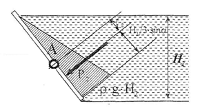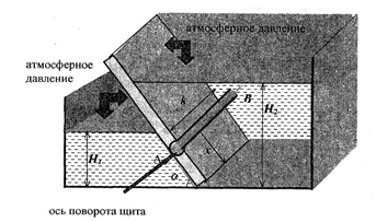 Щитовой затвор шириной должен автоматически поворачиваться вокруг оси , открываться при уровне воды и пропускать её в левый отсек. Угол наклона щита равен , температура жидкости . Коэффициент трения скольжения равен . Диаметр цапфы равен .