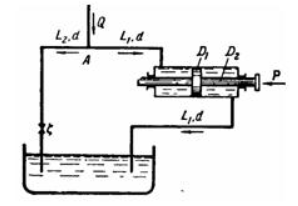 Задача (Куколевский И.И.) 10-20. Перемещение поршня гидроцилиндра (D1= 150 мм, D2 = 50 мм), нагруженного внешним усилием P=20 кГ, осуществляется подачей спирто-глицериновой смеси (v= 1 см2/сек, y=1220 кГ/м3) насосом в рабочую полость гидроцилиндра. Для регулирования скорости перемещения поршня при постоянной подаче насоса к узловой точке А системы присоединена сбросная труба с краном С. Определить: 1) Какова скорость V перемещения поршня, если подача насоса Q = 7,85 л/сек, приведенные длины труб L1 = 5 м, L2=10 м, диаметр труб Ответ. 1) v = 0,2 м/се'(. 2) vмакс = 0,5 м/сек, 3) 12мин = 2 м.