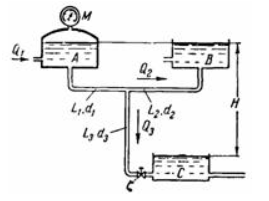 Задача (Куколевский И.И.) 10-24. Баки А, В и С соединены трубопроводами L1 = 75 мм, d1 = 75мм, и L2 = L3 = 100м, d2 = d3= 50 мм. Напор Н =10 м. Принимая величины коэффициента сопротивления трения во всех трубопроводах равными 0,03 и величину коэффициента сопротивления задвижки С =15, определить: 1) При каком давлении М на поверхности воды в баке Л в бак В будет поступать расход Qа = 5 л/сек? 2) Как нужно изменить давление М, чтобы вода не поступала в бак В?