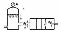 Задача (Куколевский И.И.) 7-7. В экспериментальной установке изучается истечение воды через круглое отверстие с острой кромкой диаметром d0 = 50 мм, выполненное в торцовой стенке горизонтального бака диаметром D = 200 мм. Бак снабжен двумя успокоителями из перфорированного листа. Сверления в каждом листе имеют суммарную площадь, равную 1/5 площади сечения бака, и могут рассматриваться как независимо работающие отверстия с острой кромкой, истечение через которые происходит под уровень. Вода подается в бак из резервуара по короткой подводящей труба диаметром d = 50 мм, снабженной вентилем, коэффициент сопротивления которого ? = 4,6. Определить скорость истечения и расход через отверстие при показании манометра на резервуаре М = 0,15 МПа и уровне h = 1 м, принимая для отверстия в баке и сверлений в сетках коэффициент сопротивления ? = 0,06 и сжатия струи ? = 0,62. Построить графики напоров.