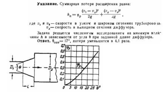 Задача (Куколевский И.И.) 7-19. Для увеличения диаметра трубопровода с D1= 150 мм до D2=300 мм конструктивно задан ограниченный переходный участок, длина которого L = 200 мм. Определить: 1) Оптимальный угол раскрытия диффузора, при котором суммарные потери расширения потока в трубопроводе будут наименьшими, пользуясь для определения потери расширения в диффузоре графиком зависимости коэффициента этой потери фр от угла. 2) Во сколько раз такой оптимальный ступенчатый диффузор снизит потери по сравнению с внезапным расширением трубопровода?