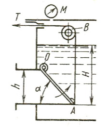 Задача (Куколевский И.И.) 2-12. Поворотный клапан АО закрывает выход из бензохранилища в трубу квадратного сечения со стороной h = 0,3 м. Прямоугольная пластина клапана опирается на срез трубы, сделанный под углом а = 45. Определить (без учета трения) силу Т натяжения троса, необходимую для открытия клапана, если уровень бензина H = 0,85 м, а давление паров бензина равно по манометру М = 5 кПа. Удельный вес бензина р = 700 кг/м3.