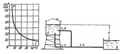 Задача (Куколевский И.И.) 10-6. Соляровое масло подается самотеком из резервуара А в резервуар В по трубопроводу, состоящему из трех одинаковых труб длинами L = 50 м и диаметрами d = 25 мм. Определить 1) Каким должен быть напор Н трубопровода, чтобы при температуре масла t=10° С в резервуар В поступал расход Q = 0,2 л/сек? 2) Как изменится расход при том же напоре, если температура масла повысится до 40°С? Местные потери в каждой трубе составляют 20% от потерь по длине. Зависимость кинематического коэффициента вязкости масла от температуры задана графиком.