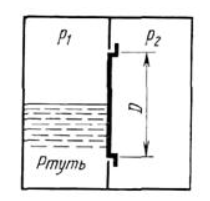 Задача (Куколевский И.И.) 2-22. Отверстие в перегородке замкнутого сосуда закрыто круглой крышкой диаметром D = 0,5 м. Левая секция залита ртутью до центра отверстия; над ртутью находится газ под абсолютным давлением р1 = 10 кПа. В правой секции находится газ под абсолютным давлением р2. Определить: