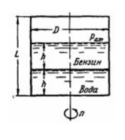 Задача (Куколевский И.И.) 4-29. Замкнутый цилиндрический сосуд размерами D = 400 мм и L = 400 мм, вращающийся с числом оборотов n = 3000 об/мин, заполнен равными объемами воды и бензина (? = 0,7), образующими слои одинаковой высоты h = 150 мм. 1) Определить, пренебрегая весомостью жидкости наибольшее давление в сосуде. 2) Растягивающие усилия Р1 и P2 в осевом сечении сосуда и в сечении, перпендикулярном его оси.