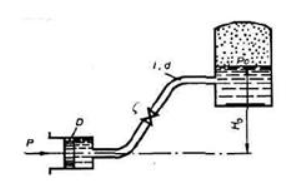 Задача (Куколевский И.И.) 9.44. Определить силу Р, которую нужно приложить к поршню насоса диаметром D = 65 мм, чтобы подавать в напорный бак жидкость с постоянным расходом Q = 2,5 л/с. Высота подъема жидкости в установке H0 = 10 м, избыточное давление в напорном баке P0 = 0,15 МПа. Размеры трубопровода l= 60 м, d = 30 мм; его шероховатость ? = 0,03 мм. Коэффициент сопротивления вентиля на трубопроводе ? = 5,5. Потери напора на плавных поворотах трубопровода не учитывать. Задачу решить для случаев подачи в бак бензина (р = 765 кг/м3, v = 0,4 сСт ) и машинного масла Трением поршня в цилиндре пренебречь