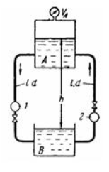Задача (Куколевский И.И.) 14-6. В экспериментальной установке вода перекачивается насосом 1 из бака А, где поддерживается постоянный вакуум VA=78 кПа., в расположенный ниже открытый резервуар В по трубопроводу общей длиной l = 10 м и диаметром d= 50 мм. Из резервуара В вода возвращается в бак А насосом 2 по такому же трубопроводу. Определить, какие напоры должны создавать насосы, чтобы в системе циркулировал расход Q=6 л/сек, если разность уровней воды Н=5 м. Коэффициент сопротивления трения 0,03, суммарный коэффициент местных сопротивлений в каждом из трубопроводов С = 6,5. При каком вакууме VА в баке насосы должны будут создавать одинаковые напоры?