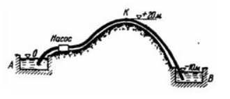 Задача (Куколевский И.И.) 14-10. Поршневой насос перекачивает нефть в количестве Qа = 0,2 м3/сек из резервуара. А в резервуар В по стальному сварному трубопроводу (шероховатость 0,2 мм) общей длиной l=8 км и диаметром d = 400 мм. 1. Определить напор и мощность насоса при заданных отметках уровней, учитывая только потери на трение. Кинематический коэффициент вязкости нефти V=0,8 см2/сек, ее удельный вес у = 840 кГ/м3. 2. Найти давление в точке K, расположенной на отметке +20 м, если длина трубопровода до этой точки l1 =4 км. 3. До какой величины можно уменьшить подачу насоса, чтобы вакуум в точке К не превосходил 5 м ст. нефти? Каков будет при этом напор насоса?