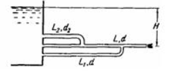 Задача (Куколевский И.И.) 10-9. Вода вытекает в атмосферу из бака с постоянным уровнем Н через трубу длиной L= 150 м, диаметром d = 50 мм. Определить: 1) При какой длине L1, параллельной ветви того же диаметра расход увеличится на 20%? 2) Какая длина L2 параллельной ветви диаметром d2 = 100 мм обеспечит такое же увеличение расхода? 3) На сколько увеличится расход, если использовать одновременно обе параллельные ветви? Задачу решить, пренебрегая местными потерями и считая коэффициенты сопротивления трения одинаковыми для всех труб.