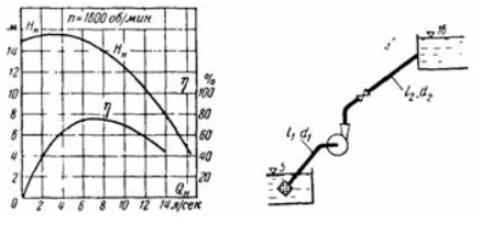 Задача (Куколевский И.И.) 14-14. Насос с заданной при n=1600 об/мин характеристикой перекачивает воду из резервуара с отметкой 5 м к резервуар с отметкой 16 м по трубопроводам l1 = 10 м, d1 = 100 мм (С = 2, л1 =0,025) и l2 = 30 м, d2 = 0,075 м (C = 12; л2 = 0,027). Определить: 1) Подачу Qп, напор Нн насоса и потребляемую им мощность Мдв при n=1600 об/мин. 2) Число оборотов n, насоса, необходимое для увеличения его подачи на 50%. Ответ. Qн = 7,3 л/сек; Hн=14,4л, Nдв=1,37 кВт.; n1= 1900 об/мин.
