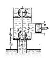 Задача (Куколевский И.И.) 3-5. Определить силу Q, прижимающую стальной (относительная плотность б = 8) шаровой всасывающий клапан радиусом R=100мм к седлу, имеющему дчаметр d = 125 мм, если диаметр насосного цилиндра D = 350 мм, а усилие по штоку P = 4000 Н. Седло клапана расположено ниже оси цилиндра на расстоянии h1 = 0,5 м и выше свободной поверхности резервуара с атмосферным давлением на расстоянии h2 = 6,5 м, причем труба под клапаном заполнена водой.