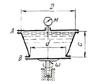 Задача (Куколевский И.И.) 4.34. Конический сосуд размерами d = 0,6 м. D= 1 м, а = 0,9 м заполнен водой и приведен в равномерное вращение с угловой скоростью w = 20 рад/с. Давление в центре крышки сосуда по манометру М = 10 кПа. Определить гидравлические нагрузки болтовых групп А и В сосуда: 1) учитывая действие силы тяжести; 2) пренебрегая действием этой силы.