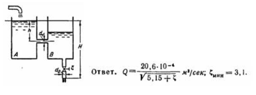 Задача (Куколевский И.И.) 7-2. Из бака А, в котором поддерживается постоянный уровень, вода протекает по цилиндрическому насадку диаметром d1 = 20 мм в бак В, из которого сливается в атмосферу по короткой трубке диаметром d2 = 25 мм. Напор H = 900 мм, а ось патрубка размещена на глубине h = 400 мм под уровнем воды в баке А. Найти зависимость расхода воды, перетекающей из бака A в бак В, от коэффициента сопротивления ? крана, установленного в трубке. Определить наименьшее значение ?, начиная с которого дальнейшее увеличение открытия крана (т. е. уменьшение его ?) не будет давать увеличения расхода. Потери на трение в трубке не учитывать. ![]()