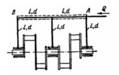 Задача (Куколевский И.И.) 10-2. Смазочное масло (б = 0,8, V = 0,06.см2/сек) подводится к подшипникам коленчатого вала по системе трубок, состоящей из пяти одинаковых участков каждый длиной l = 500 мм и диаметром d =4 мм. Определить: 1) Сколько смазки нужно подать к узловой точке А системы, чтобы каждый подшипник получил ее не менее 8 см3/сек? 2) Как изменится потребное количество смазки, если участки АВ заменить трубой диаметром D= 8 мм? Давление на выходе из трубок в подшипники считать одинаковым, местными потерями пренебречь. Ответ. 1) Q=64 см3/сек. 2) Q = 26 см3/сек. ![]()