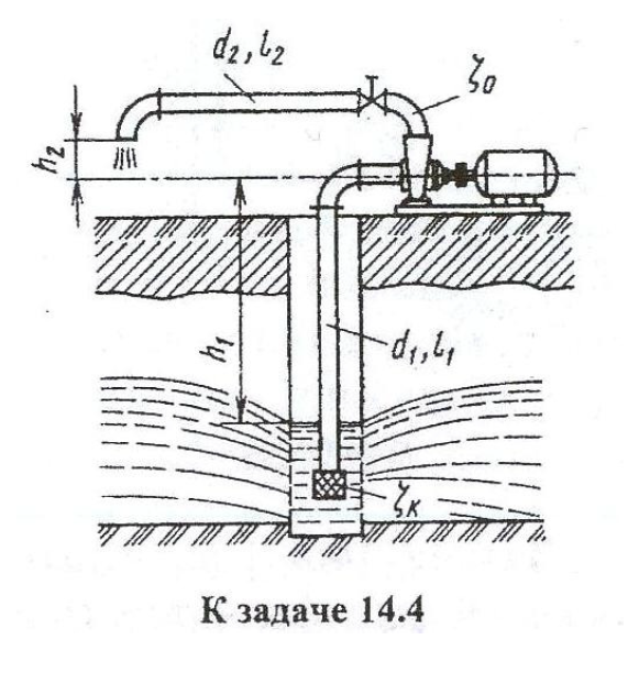 Задача (Куколевский И.И.) 14-4. Центробежный насос откачивает грунтовую воду из колодца в количестве Q = 40 л/сек. При этом горизонт воды в колодце устанавливается на h1=5 м ниже оси насоса. Определить: 1) Диаметр d1 всасывающей трубы насоса, длина которой равна l1=8 м, если вакуум перед входом в насос не должен превосходить V= 7 м. 2) Потребляемую насосом мощность при полностью открытой задвижке на нагнетательной трубе, имеющей длину l2 = 5 м и диаметр d2=150 мм, если выходное сечение ее расположено на 0,6 м выше оси насоса; к. п. д. насоса 0,7. При расчете принять коэффициент сопротивления трения трубопроводов 0,03, коэффициент сопротивления каждого отвода С0 = 0,4, коэффициент сопротивления всасывающей коробки с обратным клапаном С =5. Ответ. d1=150 мм; Мла = 4,55 кВт.