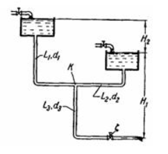 Задача (Куколевский И.И.) 10-27. Определить расходы Q1, Q2 и Q3, воды (v=0,01 см2/сек) в стальных (шероховатость 0,2 мм) трубах, имеющих длины L1 = 200 м, L2 = 100м и L3 = 150 м и диаметры d1=d3 = 100 мм, d2 = 80 мм, если напоры H1=7 м и H3 = 3 м. При какой длине L3' трубопровода 3 расход Q2 станет равным нулю?