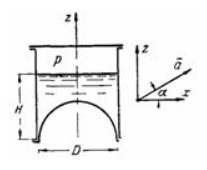 Задача (Куколевский И.И.) 4-8. Закрытый цилиндрический сосуд диаметром D = 0,6 м, имеющий полусферическое дно, наполнен до уровня H = 0,8 м водой и движется прямолинейно под углом а = 30° к горизонту с постоянным ускорением а = 2g. Определить вертикальную и горизонтальную силы давления на дно, если избыточное давление газа лад поверхностью воды в сосуде Рн = 20 кПа.