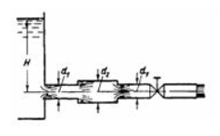 Задача (Куколевский И.И.) 7-6. Вода вытекает в атмосферу по короткому горизонтальному трубопроводу, в котором установлен вентиль, под постоянным напором H=16 м. Диаметры участков трубопровода равны d1 = 50 мм и d2 = 70 мм. Коэффициент сопротивления вентиля С = 4,0. Определить расход в трубе, учитывая только местные потери. Построить линию полного напора и пьезометрическую линию.