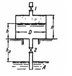 Задача (Куколевский И.И.) 1-24. К дну замкнутого цилиндрического сосуда диаметром D = 2 м и высотой H = 3 м присоединена трубка, нижним открытым концом погруженная под уровень воды в открытом резервуаре А. Сосуд установлен на высоте h0 = 2 м над уровнем воды в резервуаре и заполнен водой до высоты h0 = 2 м через открытый кран 1 при закрытом кране 2 (давление над водой равно атмосферному, Pат = 98 кПа). При открытии крана 2 и одновременном закрытии крана 1 часть воды сливается из сосуда в резервуар А. Определить: 1) Давление воздуха, которое установится при этом в сосуде. 2) Объем воды, вытекшей из сосуда. Ответ. 1) P = 34 кПа; 2) W = 1,66 м3.