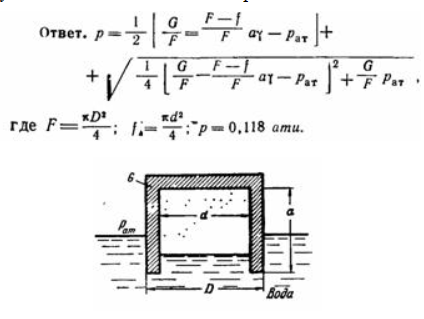 Задача (Куколевский И.И.) 1-28. Определить, какое избыточное давление воздуха установится в плавающем толстостенном колоколе диаметрами D=1 м и d = 0,6 м, высотой а =1,4 м и весом m=1,02*103 кг при давлении атмосферного воздуха, равном Рат = 100 кПа. Плотность 1020 кг/м3. Процесс сжатия воздуха в колоколе считать изотермическим.