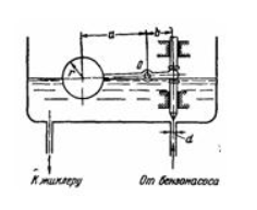 Задача (Куколевский И.И.) 3-23. Бензин (? = 0,7) под давлением р = 30 кПа подводится к поплавковой камере карбюратора по трубке диаметром d= 4 мм. Шаровой поплавок весом 25 г и игла (вес в бензине 12 г), перекрывающая доступ бензина, укреплены на рычаге (а = 40мм, b=15мм), который может поворачиваться вокруг неподвижной оси О. Определить радиус r поплавка из условия, чтобы в момент открытия отверстия поплавок был погружен наполовину (трением в шарнирах и весом рычага пренебречь).