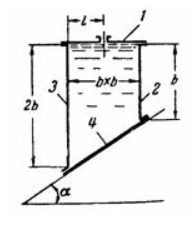 Задача (Куколевский И.И.) 4-4. По наклоненной под углом а = 45° к горизонту плоскости под действием силы тяжести скользит призматический сосуд, целиком заполненный водой. Сосуд закрыт крышкой с малым отверстием, расположенным на расстоянии l = 0,5 м от передней стенки. Собственный вес сосуда G=150 кГ, размер b=1 м, коэффициент трения дна сосуда о плоскость скольжения f= 0,278. Найти величины сил давления воды на крышку 1, стенки 2 и 3, дно 4, считая, что жидкость из сосуда не выливается.