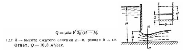 Задача (Куколевский И.И.) 6-20. Определить расход при истечении из-под щита в лотке, если напор перед щитом H = 4 м, подъем щита а = 0,8 м, ширина лотка b= 2,4 м, отверстие не затоплено и боковое сжатие отсутствует. В сжатом сечении n-n (где давление распределено по гидростатическому закону) коэффициент сжатия равен ? = 0,67 и коэффициент скорости ? = 0,97. Скоростью подхода к щиту пренебречь.