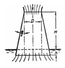 Задача (Куколевский И.И.) 7-15. В отсасывающей трубе водяной турбины, выполненной в виде конического диффузора с входным диаметром D = 0,5 м и углом раскрытия 16°, расход воды равен Q = 1,0 м3/с. Определить: 1) Вакуум во входном сечении, которое расположено над уровнем воды на высоте Н = 1,6 м, если выходное сечение трубы заглублено под уровень на h = 0,4 м, а коэффициент потерь в диффузоре 0,3. 2) Каким станет вакуум во входном сечении, если диффузор заменить цилиндрической трубой диаметром О (штрих-пунктир) с коэффициентом сопротивления трения 0,03. В обоих случаях построить пьезометрические линии по высоте трубы.