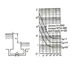 Задача (Куколевский И.И.) 7-38. Сравнить расходы воды (v = 1 сСт) и глицерина (v = 800 сСт) ори одинаковых напорах H = 2 м через короткую трубку диаметром d = 25 мм, с установленными на ней нормальным вентилем и двумя угольниками 90°. Воспользоваться приведенными кривыми зависимости коэффициентов сопротивления вентиля, угольника и входа в трубку от числа Рейнольдса потока. Коэффициент сопротивления выхода из трубки принять при Rе > 3000 равным ? =1 и при Rе < 2000 ?= 2. Потерями трения по длине трубки пренебречь.
