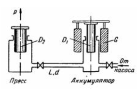 Задача (Куколевский И.И.) 9-27. Вода подается в цилиндр пресса гидравлическим грузовым аккумулятором по стальному трубопроводу длиной l = 180 м и диаметром d = 50 мм. Масса подвижных частей аккумулятора m = 40 т, диаметр его плунжера D1 = 220 мм ч к.п.д. рабочего хода 0,95. Определить усилие Р, развиваемое прессом при скоростях его плунжера v = 0,1 и 0,2 м/с. Диаметр плунжера D2 = 300 мм, к. п. д. цилиндра пресса 0,95 (весом плунжера пренебрегать). Шероховатость стенок трубопровода ? = 0,2 мм, местные потери составляют 10% потерь на трение. Вязкость воды v = 1,25 cCт.