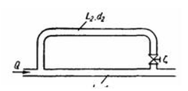 Задача (Куколевский И.И.) 10-1. Найти как распределяется расход Q = 25 л/сек между двумя параллельными трубами, одна из которых имеет длину L1=30м, диаметр d1 = 50 мм, а другая (с задвижкой, коэффициент сопротивления которой С = 3) имеет длину l2 = 50 м и диаметр d2= 100 мм. Какова будет потеря напора в разветвленном участке? Величины коэффициента сопротивления трения труб принять соответственно равными л1 = 0,04 и л2 =0,03.