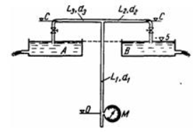 Задача (Куколевский И.И.) 10-13. Питание резервуаров A и В с постоянными и одинаковыми отметками 'уровней осуществляется подачей воды из магистрального трубопровода L1 = 40 м; d1 = 80 мм в распределительные трубы L2 = L3= 80 м и d2=d3= 50 мм, Определить: 1) Расходы, поступающие в резервуары, если давление в магистральном трубопроводе на уровне нулевой отметки М = 5 атм. 2) Как изменится расход в магистральном трубопроводе, если одну из распределительных труб выключить? 3) Какова в обоих случаях наибольшая возможная высота h расположения распределительных труб относительно уровня воды в резервуарах? Величиной заглубления труб под уровнями воды в резервуарах пренебречь и считать участки этих труб от точек С расположенными вертикально. Предельный вакуум принять равным 10 м вод. ст. Коэффициенты сопротивления трения в трубах принять ^ = 0,025, Яг=Я, = 0,03 и коэффициенты сопротивления задвижек С = 3.