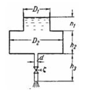 Задача (Куколевский И.И.) 11-2. Определить время опорожнения составного цилиндрического резервуара (D1=1,5 м; D2 = 2,2 м; h1 = 1 м, h2= 1,5 м) через вертикальную трубу высотой h3 = 2 м и диаметром d = 60 мм при открытом вентиле с коэффициентом сопротивления С = 4. Коэффициент сопротивления трения в трубе принять равным 0,03.