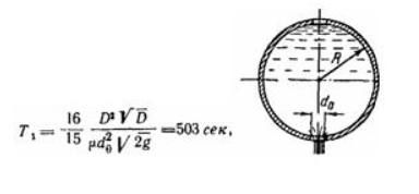 Задача (Куколевский И.И.) 11-8. Определить время опорожнения целиком заполненного шарового сосуда радиусом R = 0,8 через отверстие, диаметр которого d0 = 50 мм (коэффициент расхода 0,62). Давление на свободной поверхности жидкости во время опорожнения считать атмосферным. За какое время из сосуда вытечет половина содержащегося в нем объема воды?