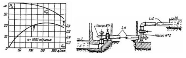 Задача (Куколевский И.И.) 14-25. Два последовательно соединенных одинаковых центробежных насоса перекачивают воду при числах оборотов n1 = n2=1000 об/мин из водохранилища А в бассейн В по трубопроводу, состоящему из двух одинаковых участков длиной l=1 км и диаметром d= 250 мм каждый (k = 0,02). Пренебрегая местными потерями, определить подачу насосов и потребляемую каждым из них мощность двигателя. Определить, как необходимо изменить число оборотов одного из насосов, чтобы увеличить расход в трубопроводе на 25%?
