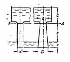 Задача (Куколевский И.И.) 6-10. Сравнить расходы при перетекании воды из верхнего бака в нижний через цилиндрическую трубу диаметром d = 300 мм, и через диффузор с тем же диаметром входа и выходным диаметром D = 600 мм, если уровни в баках постоянны, а высоты равны: а = 0,8 м. b=1,4 м, с = 0,6 м. Коэффициент сопротивления сходящегося входного участка ? = 0,05, коэффициент потерь в диффузоре ?Д = 0,25 и коэффициент сопротивления трения в трубе ? = 0,025. В обоих случаях определить также давление в сечении А-А и построить пьезометрические линии, откладывая напоры по горизонтали от осевой линии (метод построения см. в гл. 9). Указание. Коэффициент сопротивления трубы ; определяется но формуле