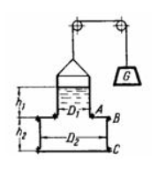 Задача (Куколевский И.И.) 4-5. Составной цилиндрический сосуд, заполненный водой до высоты h1+h2 = 800 мм, подвешен на шнуре, перекинутом через блоки, и соединен с грузом массой m = 200 кг. Определить нагрузки болтовых групп А, В и С при имеющем место ускоренном движении сосуда. Размеры сосуда D1 = 400 мм, D2=600 мм, h1 = 300 мм. Собственным весом сосуда и трением в блоках пренебречь.