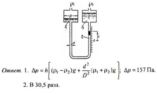 Задача (Куколевский И.И.) 1-4. Двухжидкостный микроманометр состоит из U-образной трубки диаметрам d = 5 мм, соединяющей чашки диаметрами D = 50 мм. Прибор наполнен несмешивающимися жидкостями с близкими удельными весами -водным раствором этилового спирта (?1 = 870 кг/м3) и керосином (?2 = 830 кГ/м3).