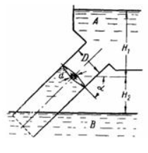 Задача (Куколевский И.И.) 2-16. Дисковый загвор диаметром D=1 м, установленный в трубе под углом а = 45° к горизонту, закрывает выход воды из резервуара А в резервуар В. Определить величину внешнего начального момента М, необходимого для открытия затвора против часовой стрелки, с учетом момента трения в цапфах затвора диаметром d = 0,15 м, если коэффициент трения f = 0,2. Задачу решить для двух случаев: