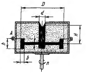 Задача 4-22. Куколевский И.И. Отливка чугунного колеса диаметром D = 1000 мм, с ободом высотой h = 200 мм и толщиной b = 80 мм, диском толщиной c = 40 мм и ступицей диаметром d = 200 мм производится во вращающуюся с n = 200 об/мин земляную форму.